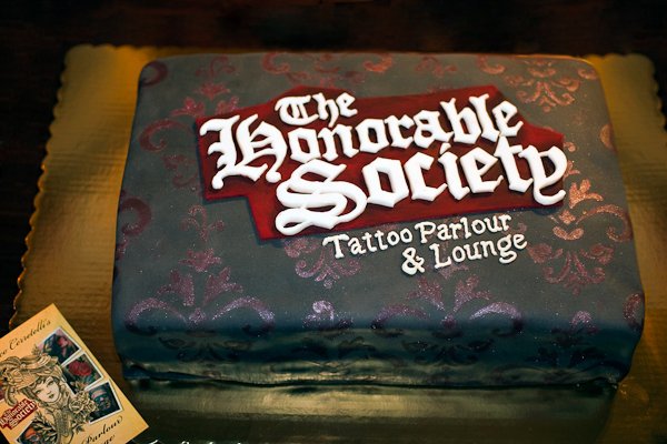 This cake was a super quick turn around, but I am glad we were able to pull it off. It was for The Honorable Society Tattoo Parlour and Lounge's grand opening party. We tried a new teqhnique out when we used a variety of stencils to achieve a flocked wallpaper look on the cake. Then we executed the logo as clean and precise as we could. I think it came great!